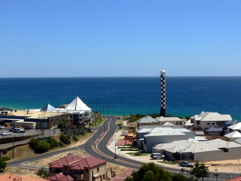 die Stadt Bunbury mit dem Schachbrett-Leuchtturm. |