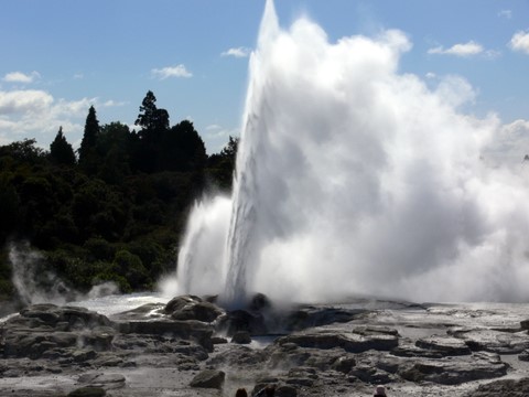 Mai Ora Wir kommen nach Rotorua, wo der Geruch nach faulen Eiern allgegenwärtig ist. Den Vormittag verbringen wir im Polynesian Spa mit Blick auf den Lake Rotorua, wo wir uns in verschiedenen Becken mit warmem bis heissem Thermalwasser entspannen. Anschliessend legen wir eine Ruhepause in unserer Unterkunft im Silver Fern, einem komfortablen Motel ein, wo wir einen eigenen Whirlpool zur Verfügung haben. Am Abend besuchen wir im Te Puia, am Rande der Stadt Rotorua, eine Maori-Kultur-Vorstellung mit anschliessendem Dinner. Es ist sehr kalt, wir frieren nach dem warmen Thermalbad vom Morgen um so mehr. Eine Maori Frau informiert die Gäste über den Ablauf des Abends. Dieser beginnt formell mit einer Begrüssungszeremonie und geschlechterspezifischen Rollenaufgaben. Danach zeigen uns die Maori Lieder und Tänze aus ihrer Kultur und lehren die männlichen Zuschauer einen Kriegstanz und die weiblichen Zuschauerinnen einen Tanz der Maori Frauen. Den Abschluss geniessen wir bei einem vorzüglichen Buffet mit "Hangi", welches u. a. aus Gemüse und Fleisch besteht, das stundenlang in der Erde zart gegart wird.